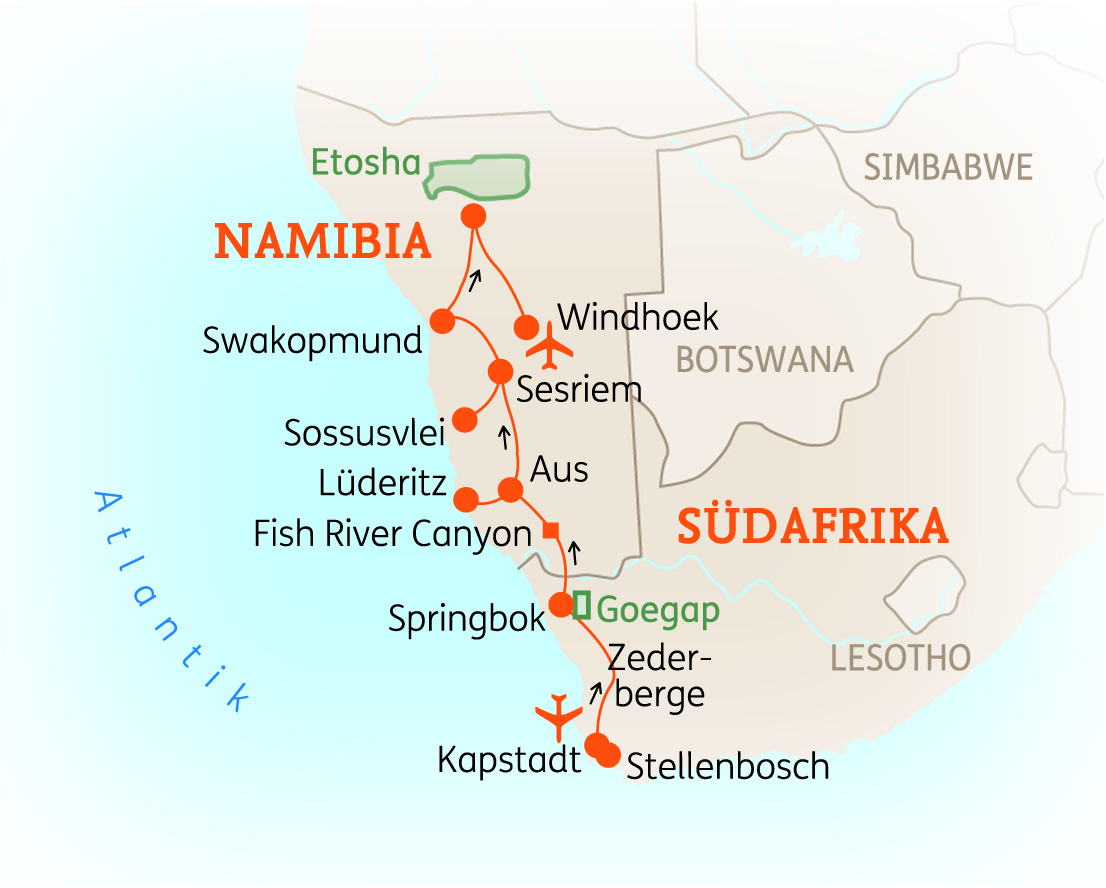 SÜDAFRIKA & NAMIBIA - Lernen Sie mit der Westküste Südafrikas und dem Süden Namibias zwei landschaftliche Juwele im Südlichen Afrika kennen. Neben den Höhepunkten wie Kapstadt, der Kaphalbinsel in Südafrika und der Dünenlandschaft des Sossusvlei sowie dem Etosha-Nationalpark in Namibia, entdecken Sie auf dieser 19-tägigen Reise auch weniger bekannte Regionen wie die Zederberge und das Namaqualand. Freuen Sie sich auf einzigartige Lan...