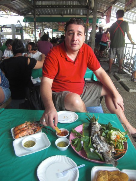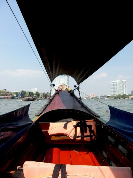 Es ist gutes Wetter, also miete ich mir ein Boot für eine Klongtour zu den Schwimmenden Märkten. Vorher kurz eben die Preise checken, wie ein Weltmeister verhandele ich, so sind Bootsführer und ich am Ende einig und glücklich. Aber aufpassen, man muss die Tour vorher mit dem Fahrer ausmachen, sonst bringt er einen zu Orchideenfarmen (von einem Verwandten) und zu den Krokodilen und zu noch vielen, vielen Stellen, die man eventuell nicht im eigenen Programm hat. Außenbordmotor angeworfen und ab auf den Fluss. An Bord eines solchen Langbootes geht es ganz schön schaukelig zu, daher gut auf die Kamera aufgepasst. Es ist mal wieder faszinierend, wie diese Stadt innerhalb von Minuten ihr Gesicht wechselt. Eben noch vorbei an den Hochhäusern und Denkmälern entlang des Flussufers, dringt man ein in die Klongwelt. Grün ist sie, und still. Wohnhäuser mit Menschen die baden, Kinder, die vergnügt winken - so ist ein Sonntagsausflug einfach nur perfekt. Am Schwimmenden Markt werde ich auch nicht wirklich fündig, was das Shopping angeht, aber dafür gibt es gegrillte Garnelen, frischen Fisch vom Holzkohlegrill und vieles mehr. Bangkok schmeckt einfach nur lecker.