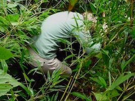 Wir arbeiteten uns durch vorwiegend dichten Bambuswald und dorniges Gestrüpp immer bergauf. Und wir hatten Glück, denn allzu oft ist es dort feucht und neblig, der Aufstieg dadurch rutschig und schwierig. An diesem Tag blieb es erfreulicherweise trocken und unsere Regencapes konnten im Rucksack bleiben. Wir hatten zudem einen Porter an unserer Seite, der uns dorniges Gestrüpp und Zweige aus dem Weg hielt, uns auf Brennnesseln und Sehenswertes aufmerksam machte, was wir sonst nicht bemerkt hätten. Zudem unterstützten wir mit der Buchung des Porters auch die Landbevölkerung, wie unser Guide uns gesagt hatte. Eine gute Empfehlung.