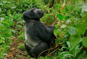 Wir alle waren atemlos, restlos begeistert und sehr leise. Der Berggorilla schaute uns sehr gelassen an und kaute relaxed weiter an seinem grünen Frühstück. Während der nächsten Stunde begegneten uns immer wieder kleine Gruppen, um uns und auch über uns. Junge Gorillas übten in den Baumwipfeln ihre Kletterkünste. Kwitonda, der Silberrücken war beeindruckend groß und hatte die Familie fest im Griff wie er uns kurz demonstrierte, indem er die Jugendlichen der Familie zur Raison brachte mit lautem Gebärden, was uns alle zuerst ziemlich erschreckte.