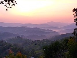 Wir kamen aus Kenia und flogen über Burundi nach Kigali, dem Herz Ruandas. Nach einer Zwischenübernachtung starteten wir sehr früh morgens nach Ruhengeri, der nächstgelegenen Stadt zu Füßen der Virunga-Vulkane. Richtung Nordwesten ging es mit dem Landrover zunächst bergauf, dabei hatten wir traumhafte Ausblicke auf die Stadt Kigali im rosaroten Morgenlicht.