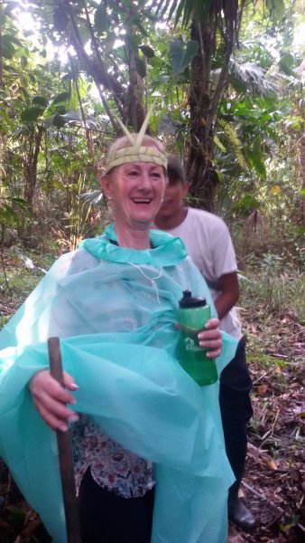 Es ist ein anstrengender Marsch, aber ich sehe in den müden Gesichtern meiner Mitstreiter auch ein Strahlen in den Augen. Renate bekommt von unserem Naturführer eine Dschungelkrone gebastelt und aufgesetzt. Wir sind in einer anderen Welt! Am Abend fahren wir in das benachbarte Dorf um das Leben der dort lebenden Kichwa „Indigenos“ kennen zu lernen. Die Frauen des Dorfes stellen uns ihre verschiedenen Aufgaben in der Dorfgemeinschaft und einige Tänze vor und der junge Schamane des Dorfes führt uns eine Heilung vor. Im Dorf wird ein Kirchenfest gefeiert und die Dorfbewohner sind im kleinen Gemeindehaus zum Gottesdienst zusammengekommen. Wir schauen uns die Zeremonie einen Moment von außen an bevor wir zurück in die Lodge fahren. Mit den Geräuschen der Natur schlafe ich ein.