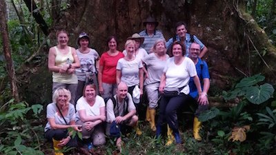 Bevor wir unsere heutige Tour auf dem Rio Napo starten können muss erst einmal der Wagenheber eingesetzt werden, denn ein Stein hat sich zwischen den Doppelreifen unseres Busses festgesetzt. Mit vereinten Kräften wird bei tropischer Hitze auf Hochtouren gearbeitet bis der Stein sich endlich löst. Aber damit nicht genug, auch im zweiten Reisen hat sich ein Stein verkeilt der gelöst werden muss. Unser Busfahrer Luis muss erst mal was trinken bevor wir endlich losfahren können. Am Ufer des Rio Napo steigen wir in Boote um zur Tierauffangstation „amaZOOnico“ zu gelangen. Wegen Niedrigwassers müssen wir aber nach einiger Zeit aus dem Boot steigen um einen Teil des Weges zu Fuß abzulegen und über steiniges Geröll zur anderen Uferseite zu gelangen. Es ist heiß und die Luftfeuchtigkeit hoch. Trotzdem sind wir guter Dinge und genießen das kleine Abenteuer. In der größten und ältesten Station Ecuadors werden Tiere aus dem illegalen Tierhandel gesund gepflegt und wenn möglich wieder im Schutzwald ausgewildert. Rund 500 Tiere- unter anderem Affen, Brillenbären, Tapire, Pekaris, Tukane und andere Vogelarten leben hier und warten auf ihre Auswilderung. Weiter geht es den Fluss abwärts zum geschützten Primärwald „ Selva Viva“ auf eine Dschungelwanderung. Hier ist der Dschungel noch viel dichter als am Vortag und es ist noch beschwerlicher sich bei der großen Hitze durch die unwegsamen Wege zu schlängeln. Unser Naturführer macht uns als Vorreiter mit der Machete den Weg frei. Trotz aller Beschwerlichkeiten genießen wir jeden Moment und werden mit Blicke auf exotische Pflanzen und riesige Schmetterlinge belohnt. Am Ende des Pfades stehen riesige … Bäume. Gruppenfotos werden gemacht bevor wir uns auf den Rückweg zum Boot machen. Auf der Weiterfahrt nach Puerto Misahualli stoppen wir noch bei einem Kichwa Dorf um als Mittagessen einen superleckeren Tilapia (Fisch) zu verspeisen. Unser Bus erwartet uns schon im kleinen Dschungelstädtchen und wir genießen auf der Rückfahrt den Sonnenuntergang. Nach dem Abendessen in der Lodge dürfen wir gemeinsam mit unserem Reiseleiter und dem Naturführer unsere eigene Schokolade herstellen. Wir mahlen Kakao, mischen ihn mit Zucker, Milch und Zimt und kochen ihn auf. Dazu werden uns frische Erdbeeren und Bananen gereicht. Köstlich!