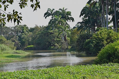 Die Lodge liegt in einem wundervollen tropischen Garten mit vielen blühenden Pflanzen und einem kleinen See mit Fischen und Wasserschildkröten. Nachdem wir unsere heimeligen Bungalows bezogen haben geht es mit Gummistiefeln ausgestattet bei leichtem Regen mit unserem örtlichen Naturführer auf eine kleine Wanderung durch den Dschungel zum Wasserfall Hausaquila. Wir sehen Termitenbauten, diverse Heilpflanzen der indigenen Bevölkerung und verschiedene Vogelarten und dürfen uns an Lianen durch die Lüfte schwingen.
