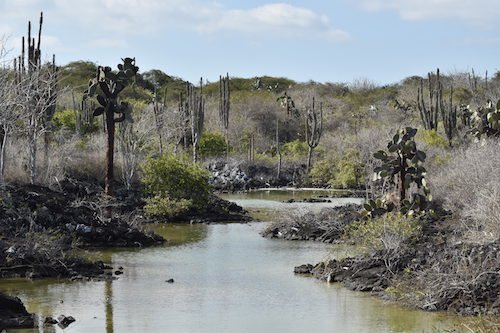 Heute geht es ins Hochland der Insel Santa Cruz. Unser örtlicher Naturführer holt uns mit einem Bus ab und wir fahren ins Inselinnere. Die Landschaft ändert sich von der trockenen kakteenreichen Ebene zur gebirgigen feuchten Region mit grünen Wiesen und Scalesia Wäldern. Auf unserer Fahrt zu den Los Gemelos entdecken wir schon links der Straße riesige wilde Schildkröten. Die Zwillingskrater (Los Gemelos) sind in Wirklichkeit keine richtigen Krater, sondern haben sich durch einen Einsturz des Oberflächenmaterials zu Spalten und Kammern herausgebildet. Sie sind mittlerweile gut bewachsen und Lebensraum für Sumpfohreulen und weitere Vögel.