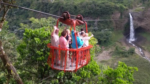 Nach dem Frühstück treffen wir uns zu einer Wanderung zur Statue Virgen del Agua Santa, einer Marienfigur oberhalb des Ortes Banos, die man nur über einen Weg mit über 600 Stufen bergauf erreichen kann. Langsam schleppen wir uns den Weg hinauf, doch oben angekommen eröffnet sich zu unserer Begeisterung ein wundervoller Ausblick auf die Stadt. Es geht weiter, fast auf einer Ebene oder mit nur leichten Anstiegen über einen landschaftlich wunderbaren Pfad zum Aussichtscafe „Cafe del Cielo“ im Luxushotel Luna Runtum, das auf einer steilen Felswand mit Blick auf Banos thront. Geplant war hier zu Mittag zu essen, aber leider ist das Café geschlossen. Planänderung! Unserer unser Busfahrer erwartet uns schon um noch weiter bergauf zur nächsten Attraktion zu fahren. Was zunächst aus der Ferne wie eine alte, langweilige Holzschaukel, die an einem kleinen Baumhaus baumelt, ist in Wirklichkeit eine wahre Touristenattraktion. Kein Wunder, schließlich befindet sich die besagte Schaukel direkt über dem angrenzenden Tal und man schwingt etwa 2600 Meter über dem Meeresspiegel hin und her.