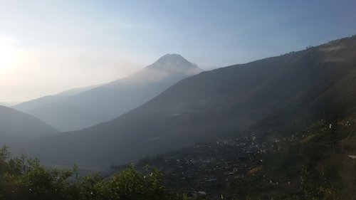 Ein neuer spannender Tag. Wir müssen heute noch früher aufstehen als sonst, denn unser Zug in Alausi fährt nur einmal am Tag. Die Sonne scheint und, kaum zu glauben, wir haben einen supertollen Blick auf Mama Vulkan Tunguraua. Zum Glück dampft und spuckt er nicht sondern zeigt sich von seiner ruhigen aber sehr klaren Seite. Erst 2016 hatte er Dampf, Asche und Lava gespuckt. Auf der Weiterfahrt sehen wir schon von weitem die weiteren Vulkane Althar und den größten Vulkan Chimborazo. Sind wir nicht Glückskinder? Auf dem Weg machen wir einen Stopp bei der frühkolonialen Kirche La Balbanera, der ältesten Kirche Ecuadors. Als eines der ersten Gebäude haben die Spanier das schlichte und dennoch eindrucksvolle Gotteshaus im Jahr 1524 errichtet.