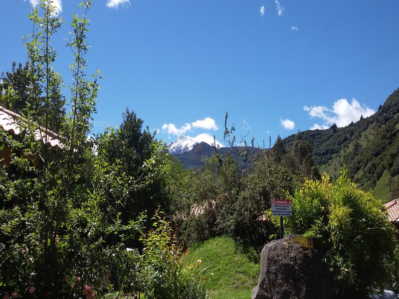 Erst am nächsten Morgen eröffnet sich uns der Blick auf die wunderschöne Gartenanlage und die großen Pools der Thermalanlage. Morgens um 06.00 Uhr, noch vor dem Frühstück, treffen sich die Frühaufsteher zum ersten Bad. Wir fahren erst am Späten Vormittag ab um die Quellenanlage genießen zu können und haben an diesem Tag das Glück bei strahlendem Sonnenschein den nahe gelegenen Vulkan Antisana (5758 m) mit seinem schneebedeckten Gipfel von unserer Gartenanlage aus zu sehen. Der Abschied fällt schwer, denn das Hotel und die Landschaft sind traumhaft. Allerdings nur kurz, denn die Straße gen Süden führt durch üppig grüne Landschaft mit tiefen Schluchten, kleinen Wasserfällen und einem wildromantischen Flusslauf in Richtung Dschungel. Im kleinen Ort Baeza, erstürmen wir den Supermarkt und einen kleinen Obstladen bevor wir in unsere Amazonas Lodge Huasaquila im heiligen Tal von Cotundo fahren. Dort werden wir schon erwartet und mit einem köstlichen Mittagessen begrüßt.