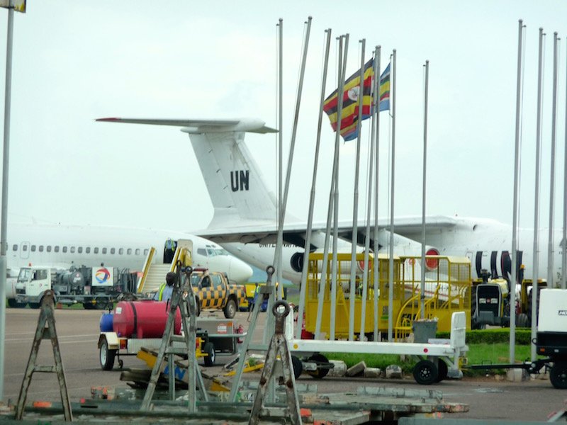Eigentlich hätten wir in der Maschine auf Goetz treffen sollen, dieser hatte jedoch Verspätung mit seinem Flug aus London. Wir erfuhren, dass wir erst in Kampala zusammentreffen würden, damit war das Anreisechaos für den Anfang ja perfekt. Uganda empfing uns regnerisch und mit grauem Himmel. Auf dem Flughafen sahen wir bei unserer Ankunft einige Flugzeuge der UN, die Entebbe als Drehscheibe zur Weiterfahrt in den Kongo nutzen, um dorthin Hilfsgüter zu transportieren. Wir wussten, dass wir in die beginnende Regenzeit nach Uganda reisten, hofften jedoch auf unser Glück.