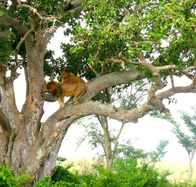 Unsere nächste Reisetappe führt uns in den Ishasha Sektor des Queen Elizabeth National Park. Wir bewegen uns überwiegend auf fester Sandpiste durch eine für uns wunderschöne, afrikanische Landschaft. Nur wenige Fahrzeuge begegnen uns und wir haben das Gefühl fast allein auf dem Weg nach Ishasha zu sein. In einiger Entfernung machen wir immer wieder einige Elefanten aus. Emma entdeckt plötzlich einen der seltenen Baumlöwen kurz bevor wir den Ishasha Sektor des Nationalparks erreichen. Außer im Lake Manyara Nationalpark in Tanzania hat man nur in Ishasha die seltene Gelegenheit Löwen auf Bäumen zu sehen. Man vermutet, dass sie aus Gründen der Übersicht auf ihre Jagdbeute in die Bäume klettern. Wir hätten den Löwen übersehen, dafür sind unsere Augen nicht gut genug geschult und das Baumgrün gewährt zudem eine gute Tarnung. Es handelt sich um ein junges Tier, wie Emma uns erklärt und er vermutet das Muttertier in der Nähe. Wir bleiben einen Moment und setzen unsere Fahrt in die Ishasha Region fort.