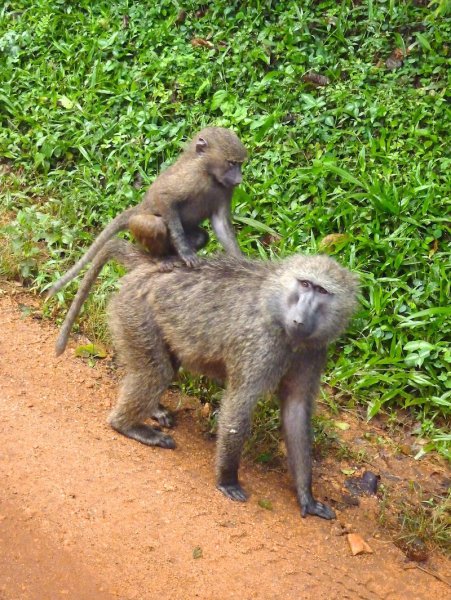 Auf einer Safari fängt der Tag immer sehr rechtzeitig an. Nach einem kurzen Frühstück und mit einem traumhaften Sonnenaufgang, der den Kratersee in ein rosarotes Farbenmeer taucht, fahren wir in gut 45 Minuten über Sandpisten und wieder an vielen Plantagen vorbei zum Eingang des Kibale Forest Nationalpark. Bereits bei der Einfahrt kreuzen einige große Paviangruppen unseren Weg. Die weiblichen Tiere tragen ihre Kinder Huckepack und beäugen uns genauso neugierig wie wir sie.