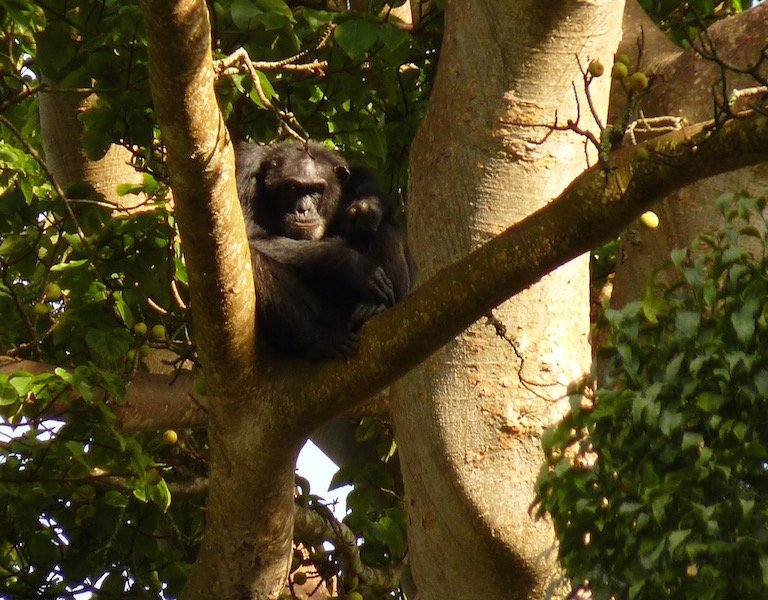 Nach ungefähr 1 Stunde treten wir auf eine kleine Lichtung und trauen unseren Augen kaum. Auf einer Baumgabel sitzt ein großer Schimpanse und beäugt uns interessiert, kaum dass wir ihn wahrgenommen haben. Ein unglaubliches schönes Bild und ein Geschenk für uns alle. Ganz offensichtlich genießt der Schimpanse genau wie wir die wärmende Morgensonne. Insgesamt tummeln sich 6 bis 7 Tiere unterschiedlichen Alters und Fellfarbe in dem großen Baum. Ganz ruhig und sehr aufmerksam verbringen wir so einige Zeit und beobachten die Schimpansen einfach nur, bis zwei den Baum hinunterklettern. Schnell fordert Alex uns auf ihm zu folgen und mit Tempo geht es nun wieder durch den dichten Wald. Wir sind froh, dass wir Alex nicht aus den Augen verlieren, geschweige denn die Schimpansen. Wie Speedy Gonzales sprintet er mit unserer Gruppe durch das Dickicht. Eine spannende wie auch anstrengende Angelegenheit, wie sich herausstellt. Gott sei Dank verlieren wir Alex und die Schimpansen nicht aus den Augen und wir werden für unseren sportlichen Ehrgeiz belohnt. Einer der Schimpansen sitzt uns plötzlich in sehr kurzer Distanz am Boden gegenüber und schaut uns ziemlich skeptisch direkt an. Dann verschluckt ihn das Dickicht des Waldes wieder so schnell dass man glauben könnte, die Begegnung wäre nur ein Spuk gewesen ist.
