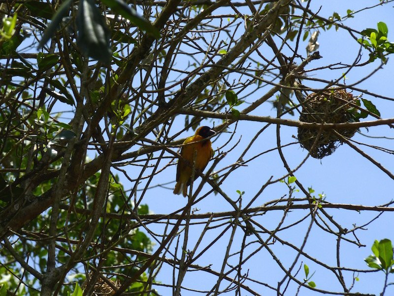 Was für ein unbeschreiblich schönes Erlebnis. Wir sind glücklich, dankbar und jeder verarbeitet dieses Erlebnis ganz für sich. Alexander und Götz unternehmen eine weitere Wanderung durch das Bigodi Wetland, um noch andere Primaten zu sehen oder um schöne Vögel zu entdecken. Ich bevorzuge meine Schuhe auszuziehen und treffe kleine, neugierige Kinder aus dem nah gelegenen Dorf. In einem riesigen Baum hängen die Nester der Webervögel in Massen herab und ich schaue Ihnen gespannt bei Ihrem akkuraten Hausbau zu. Nach einer guten Stunde lesen Emma und ich unsere beiden Ornithologen an einem vereinbarten Treffpunkt auf. Meine Gamaschen sind mittlerweile wieder trocken und ich erzähle den beiden wie Webervögel ihre Nester bauen, während sie mir von großen Ameisenstraßen berichten und von den Tieren, die sie auf ihrer Tour sahen.