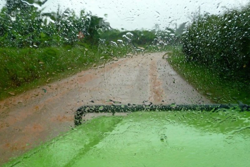 Kurz vor Fort Portal ging unsere Fahrt auf festen Sandpisten und mittlerweile im Platzregen weiter. Wir schlossen die Fenster um zu verhindern dass Spritzwasser in den Jeep gelangte, denn innerhalb kürzester Zeit bildeten sich große Schlaglöcher im sandigen Boden und aus kleinen Rinnsalen wurden schnell tiefe Wasserteiche. Die allgemeine Stimmung war in diesem Moment grau, genau wie das Wetter. Wir stellten uns mittlerweile die Frage, ob die Regenzeit wohl gänzlich mit uns angekommen war.