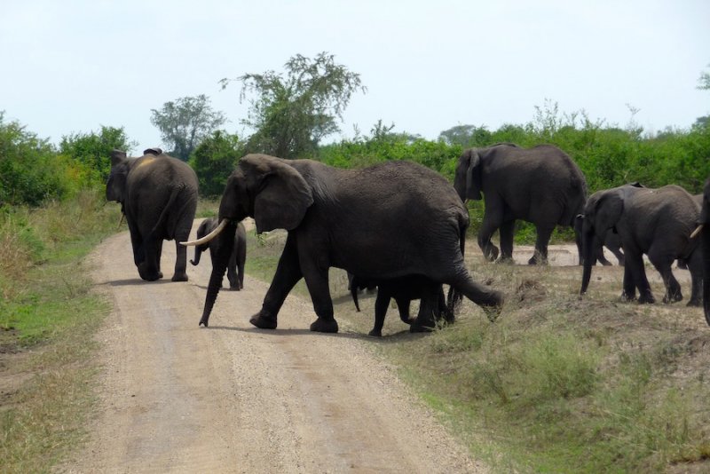 Gerne würden wir noch bleiben, aber unsere Reise geht weiter Richtung Süden, zu unserem nächsten Ziel, dem Queen Elizabeth Nationalpark. Einige Zeit fahren wir wieder auf den uns nun bekannten Sandpisten, durch Bananenplantagen und an Teeplantagen vorbei bis wir die Hauptstraße Richtung Kasese erreichen. Dann verlassen wir die Höhen und die Landschaft verändert sich sofort, zeigt sich mit einem Mal als afrikanische Steppe. Zudem wird es erfreulicherweise noch einmal merklich wärmer bis wir schließlich den Äquator erreichen. Wie alle Touristen halten wir für einen Fotostopp und haben den Queen Elizabeth Nationalpark fast auch erreicht. Durch ein Nebentor fahren wir in den Nationalpark und nach nur wenigen Minuten passiert eine große Elefantenherde die Piste. Was für ein Glück. Die erwachsenen Tiere schützen die ganz kleinen Dickhäuter, indem sie diese in ihre Mitte nehmen. Egal wie oft wir schon Elefanten während unserer Reisen gesehen haben, es ist immer wieder schön ihnen zu begegnen. Diese Tiere strahlen eine unglaubliche Gelassenheit und Selbstsicherheit aus. Sie sind aufmerksam, intelligent und sehr fürsorglich. Afrika zu bereisen ohne Elefanten gesehen zu haben, ist für mich gleichbedeutend nicht in Afrika gewesen zu sein. Es ist bestürzend zu lesen, dass illegales Elfenbein nach wie vor tonnenweise verbrannt wird. In diesem Zusammenhang weise ich sehr gerne auf den David Sheldrick Wildlife Trust hin http://www.sheldrickwildlifetrust.org, der seit vielen Jahren unermüdlich für den Erhalt der Elefanten und ihren Fortbestand kämpft und den wir gerne unterstützen.
