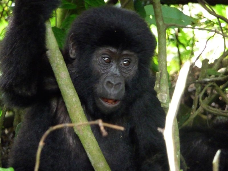 Wir haben ausgiebig Zeit, uns über das kleinste Familienmitglied zu amüsieren. Ein wenige Monate alter Gorilla tollt zwischen den erwachsenen Gorillas herum und versucht lebhaft, sie zum spielen zu animieren. Ein richtig frecher Kerl. Nach einer Stunde müssen wir uns leider wieder von den großen Menschenaffen verabschieden und nehmen nach einer kurzen Picknickpause den gleichen Weg zurück an den Ausgangspunkt. Der Abstieg gestaltet sich für mich schwerer als der Aufstieg, denn die Kondition lässt nach und ich sehe mich danach auszuruhen. Nach jeder kleinen Pause fällt mir das Weitergehen schwerer und ich bin glücklich, als uns die letzten Schritte wieder aus dem Bergregenwald führen.