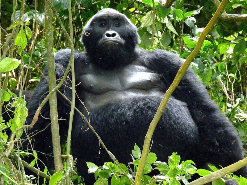 Ein stattlicher Silverback mit ungefähr 250 kg Lebendgewicht, sowie zwei kraftstrotzende, jüngere Blackbacks bilden mit weiteren 16 Familienmitgliedern die Gorillafamilie Rushegura. Als unvermittelt eine Pavian Gruppe in der Nähe auftaucht, wird es kurzfristig ziemlich hektisch, sowohl in unserer Besuchergruppe, wie auch bei den Gorillas. Der Silverback sowie einige Teenager vertreiben die Paviane lautstark und äußerst beeindruckend. Ein sich in unmittelbarer Nähe und schnell bewegender Silverback lässt einem den Atem anhalten, dennoch kann man sich der Faszination nicht entziehen und wir genießen jede einzelne Sekunde.