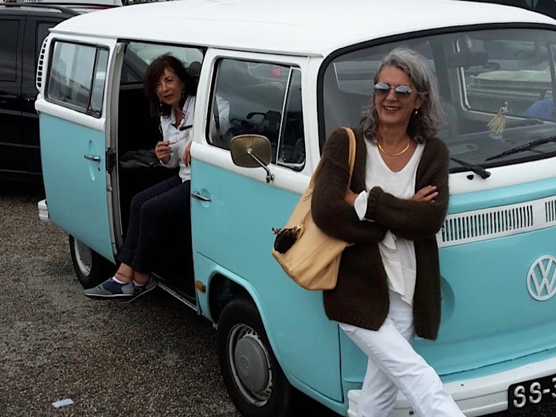 9:30 Uhr. Wir stehen vor dem Hotel bereit zu neuen Taten. Da fahren zwei alte VW-Bullis vor, der eine türkis und der andere lila. Cool sehen sie aus, unsere Transportmittel für die Fahrt in die Umgebung und an den Atlantik. Es fehlen nur noch die Surfboards auf dem Dach.