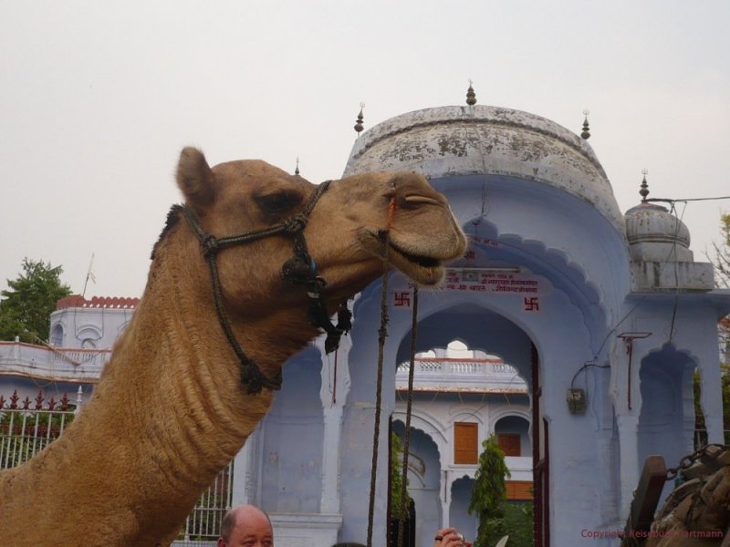Freundlicher Empfang im sehr charmanten, kleinen Heritage Hotel - Surajgart Fort. Wir werden mit Blumenkranz, Trommeln und Erfrischungen von einem fröhlich, freundlichem Hotelmanager begrüßt. Nach einer außergewöhnlichen Kamelkutschfahrt durch den Ort erleben wir ein wunderschönes, romantisches Abendessen auf der Dachterrasse mit Musik und Marionettentheater. Ein paar Besucher werden als Maharani und Maharadscha verkleidet, was zu allgemeinem Gelächter führt.