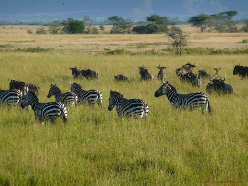 Vom Krater aus ging es weiter in die sagenhafte, berühmte Serengeti. Das Gras ist hier kurz und es gibt nur wenige Bäume, so dass man seinen Blick in die Ferne schweifen lassen kann. Da wir in der Zeit der großen Tierwanderung dort waren, konnten wir die großen Herden von Gnus und Zebras mit ihrem Nachwuchs bewundern. Man muss es gesehen haben, um es zu glauben wie viele Tiere hier instinktiv jedes Jahr an die gleiche Stelle kommen, um Ihre Jungen aufzuziehen.
