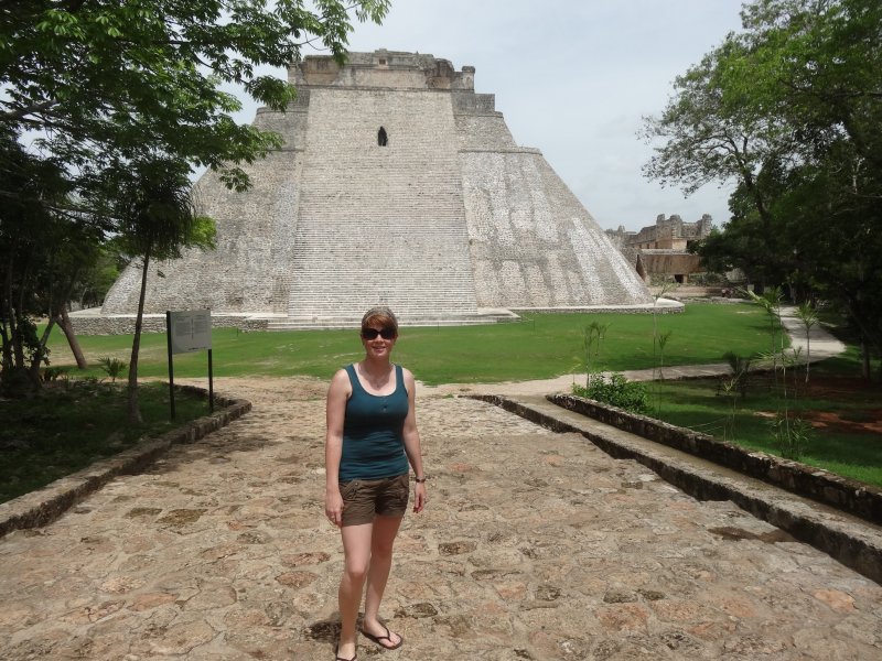 Die Maya-Stätte Uxmal ist weniger bekannt und dadurch auch nicht so überlaufen. Wir stehen fasziniert vor der Pyramide des Zauberers. Sie besitzt statt der üblichen rechteckigen Grundstruktur ein Oval als Basis, weshalb sie einzigartig in der Maya-Architektur ist. Vorbei geht es an ehemaligen Wohnhäusern, dem Palast des Gouverneurs, zur Hauptpyramide „Pirámide Mayor“. Wir haben die Möglichkeit dieses prächtige Bauwerk zu besteigen. Ein kleiner Teil der Gruppe und ich trauen sich die vielen Treppenstufen zu erklimmen um dann die atemberaubende Aussicht zu genießen. Die Freude weilt nur kurz, als wir merken, dass wir auch irgendwie wieder hinunter kommen müssen. Von oben sehen die Stufen auf einmal viel schmaler aus und die Tiefe erscheint unheimlich. Wir klettern 'auf Händen und Füßen' wieder nach unten.