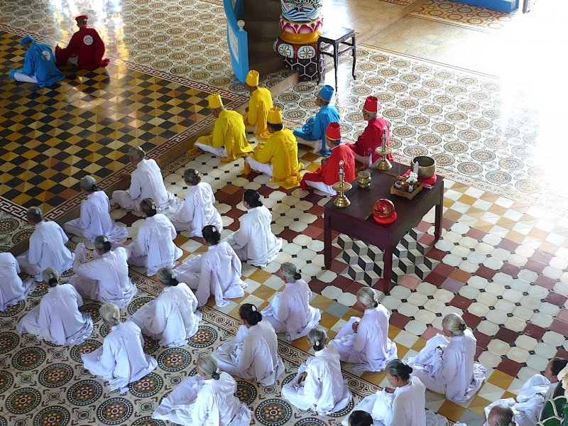 04.11.2013 Der Wecker klingelt uns alle früh raus, denn wir haben einiges vor. Unser heutiger Ausflug führt uns 120 km nordwestlich von Saigon nach Tay Ninh, wo sich der Hauptsitz der Caodai Sekte befindet. Auf der Fahrt dorthin erscheint die Stadt nun doch nicht mehr so aufgeräumt. Auf den Straßen in der Stadt tummeln sich unzählige Mofas auf den zum Teil dreispurigen Straßen. Während der Fahrt erfahren wir viel über die vietnamesische Wirtschaft und Sprache. Rechtzeitig zur Mittagszeit erreichen wir die riesige Anlage mit dem bunt bemalten und schön verziertem Dom und können von der Empore aus beobachten, wie die weiß gekleideten Gläubigen und bunt gekleideten Würdenträger zur Zeremonie in das Gebäude einziehen. Nach dem Mittagessen geht es über Kautschuk Plantagen und kleinere Straßen zu den weltberühmten Cu Chi Tunneln. Auf dem Weg dorthin erzählt uns unser Reiseleiter vom Vietnamkrieg, den Hintergründen und seinen eigenen Erlebnissen.