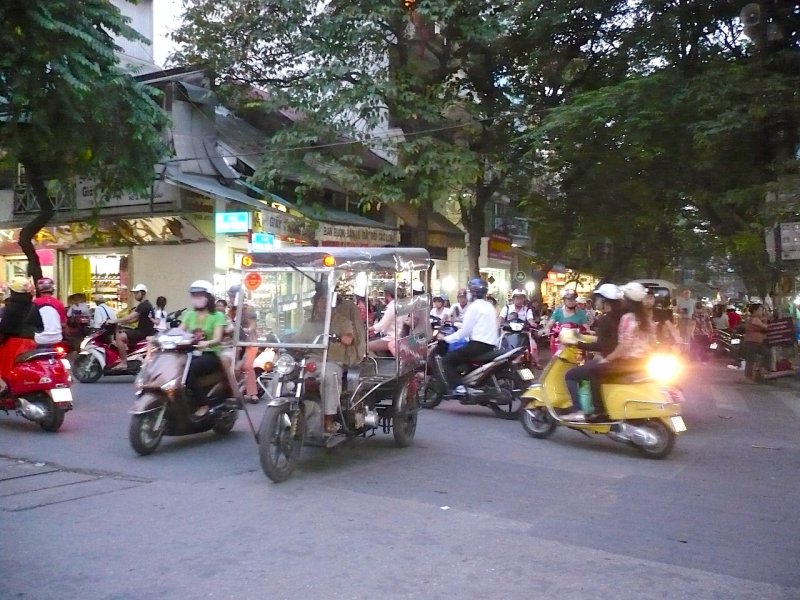 Nach der sehr unterhaltsamen Vorstellung geht es auf die kleine Insel im Hoan-Kiem-See die wir über eine rot lackierte Holzbrücke erreichen und auf der sich der Jadeberg-Tempel (Den Ngoc Son) befindet. Als Abschluss des Tagesprogramms geht es in die quirlige Altstadt, einem unglaublichen Gewirr an schmalen Gassen. Auf den Bürgersteigen haben Händler ihre Waren ausgebreitet, wobei sich in jeder Straße eine bestimmte Zunft niedergelassen hat. Und so sind die Straßen nach den Artikeln benannt, die hier solange man denken kann, verkauft werden. Hang Ca (was soviel bedeutet wie "Ware Fisch") ist die Fischgasse, Hang Bo die Korbgasse, Hang Buom die Gasse der Segelmacher, Hang Non die Gasse der Hutmacher und Hang Hom die Sarggasse. Neben den vielen Menschen drängelt sich auch ein Gewimmel an Mopeds durch die engen Gassen. Schade, dass wir nicht mehr Zeit für den Bummel hatten. Nach einem köstlichen Abendessen, in einem netten Restaurant, fahren wir zu unserem Hotel.