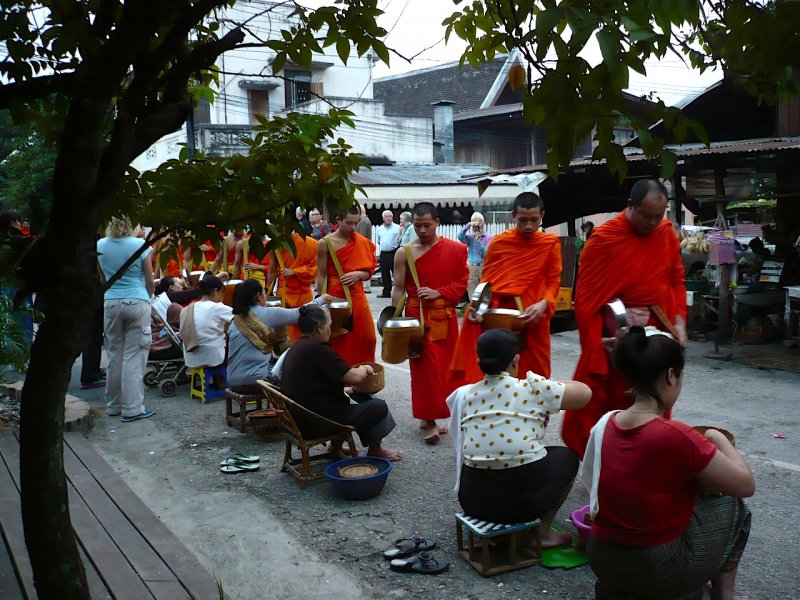 Gleich nach dem Frühstück starten wir mit unseren Besichtigungen. Nach einem schnellen Geldwechsel beginnen wir mit dem ehemaligen Königspalast, der heute als Nationalmuseum dient. Im Anschluss besichtigen wir diverse sehr prachtvolle Tempel + Stupas und schlendern durch den Altstadtbereich. Wir sind alle sehr beeindruckt von den wundervollen Bauwerken, den geheimnisvoll lächelnden Buddhafiguren, den schön restaurierten französischen Kolonialhäusern und der entspannten Atmosphäre der Stadt.