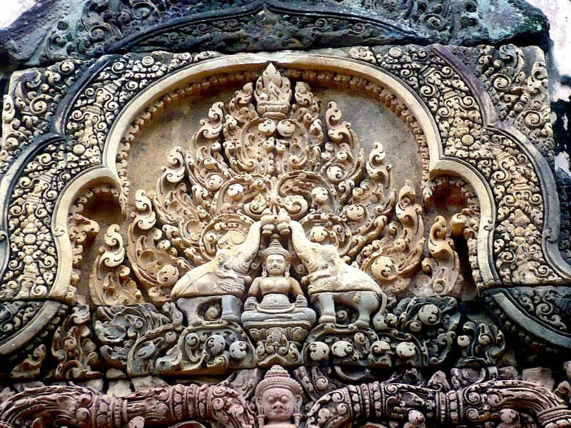 15.11.2014 Wir starten unsere Tour mit einer Fahrt zu den etwas außerhalb der Stadt liegenden Tempelanlagen. Vorbei geht es an Reisfeldern und kleinen Dörfern mit den typischen Pfahlhäusern zu einem der ältesten Shiva Heiligtümern Banteay Srei. Er ist einer der kleinen Tempel der Angkor Ära, aber sicherlich der Kunstvollste von ihnen. Seine filigranen Steinmetzarbeiten machen ihn einzigartig und sehr bekannt. Wir sind froh, dass wir schon so früh angekommen sind, denn beim Verlassen kommen uns unglaubliche Touristenmassen entgegen.