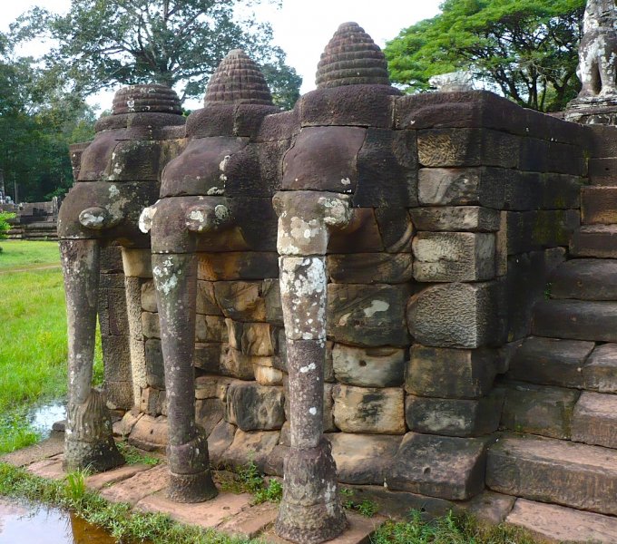Ebenso sehenswert ist die in der Nähe gelegene 350 m lange Elefantenterrasse, die für öffentliche Zeremonien genutzt wurde. Neben einer Elefantenparade werden Löwen sowie lebensgroße Garudas abgebildet. Wir schlendern weiter, vorbei an den Tempel Bapgoun, dem Königspalast und dem Tempel Phimeanakas. Nördlich schließt sich die sieben Meter hohe Terrasse des Leprakönigs an, ebenfalls geschmückt mit Statuen und Reliefs. So langsam können wir uns nicht mehr konzentrieren, denn wir sind erschlagen von der Pracht der vielen Tempel. Zum Glück schreibt uns unser Reiseleiter einen Spickzettel mit allen Tempelnamen. Wir machen eine kleine Mittagspause um uns dann die Tempel Neak Pean, Ta Som, Mebon und Pre Rup anzusehen. Als letzten Tempel steuern wir Ta Prohm an. Auf dem Fußweg zum Tempel spielt eine Gruppe durch Landminen Versehrter folkloristische Musik. In dieser Tempelanlage wird es für uns nun vorstellbar, wie der Dschungel einen Tempel einnehmen kann. Riesige bis zu 600 Jahre alte Bäume ragen über die Türme der Tempelruine hinaus. Meterdicke Baumwurzeln haben sich durch die massiven Mauern gefressen und hinterlassen eine überaus mystisch wirkende Anlage. Hier wurden Teile des Films Tomb Raider gedreht. Wir laufen, leider mit vielen anderen Touristen, durch den Tempel und bewundern die wunderschönen Reliefs, die in dieser Umgebung besonders antiquiert wirken. Leider wurden schon einige Baumriesen komplett entfernt und auch dieser Tempel restauriert, so dass in einigen Jahren leider von dieser Mystik nichts mehr übrig bleiben wird. Sehr schade.