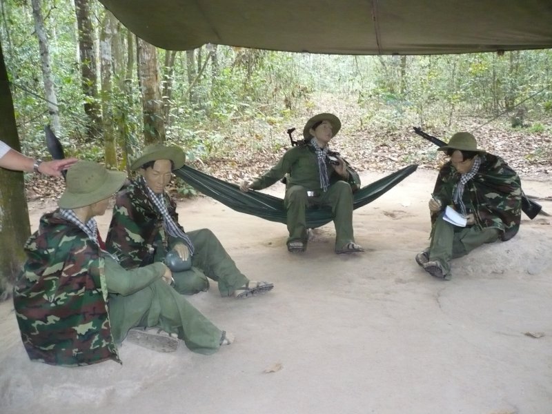 Ein ausrangierter alter amerikanischer Panzer, ein Bombenkrater, dichtes Buschwerk: Im "Vietcong Park" von Cu Chi, 35 Kilometer nordwestlich von Ho Chi Minh Stadt, dem früheren Saigon, gelegen, wird die Vergangenheit des Vietnam-Krieges so lebendig wie nirgends sonst in der Sozialistischen Republik. Direkt unter der amerikanischen Militärbasis errichteten die Vietcong-Kämpfer mit Schaufel und Spaten ihren wichtigsten Stützpunkt im Süden. Für Touristen wurde beim Dorf Ben Dinh ein Teil des Tunnelsystems verbreitert. Auf allen Vieren kann man auf einer 60 Meter langen Schaustrecke kriechend und schwitzend das Tunnelsystem besichtigen. Auch in unserer Gruppe finden sich einige Mutige. In der Dämmerung fahren wir zurück nach Saigon.