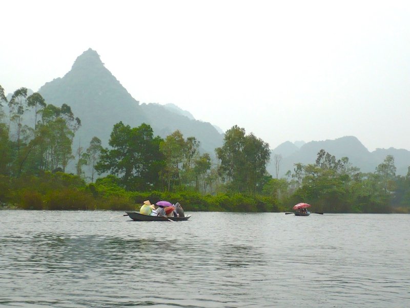 10.11.2013 Es regnet leicht. Trotzdem fahren wir in südwestliche Richtung, vorbei an vielen typisch vietnamesischen Dörfern in den kleinen Ort Ben Duc. Dort angekommen besorgen wir uns von den unzähligen Händlerinnen erst einmal zusätzliche Regenbekleidung, denn die kleinen Ruderboote an der Anlegestelle sind ohne Dach. Bei leichtem Regen gleiten wir mit unseren Booten durch eine wunderschöne Landschaft. Es ist so schön still und am Wassersaum wachsen zahllose Seerosen. Einfach märchenhaft! Nach etwa einer Stunde erreichen wir unser Ziel. Über Treppen geht es bergauf zur ersten Pagode Thiern Tru (»Pagode die zum Himmel führt«). Weiter geht es immer schweißtreibend bergauf, vorbei an unzähligen Verkaufsständen und der Seilbahn zur nächsten sehr unscheinbaren Pagode. Dort geben wir auf und kehren um, denn der Weg ist sehr rutschig und die Parfumpagode noch immer in weiter Entfernung. Die uns zur Verfügung stehende Zeit reicht nicht dafür aus hin und rück zu laufen. Zum Glück hat es aufgehört zu regnen und wir können die Rückfahrt im Ruderboot bei leichter Sonne und ohne Regenkleidung genießen. Zurück in Hanoi angekommen essen wir wieder in einem sehr schönen Restaurant bevor es zurück ins Hotel geht. Leider hat es heftig angefangen zu regnen. Der abgeschwächte Taifun hat uns nun doch erreicht.