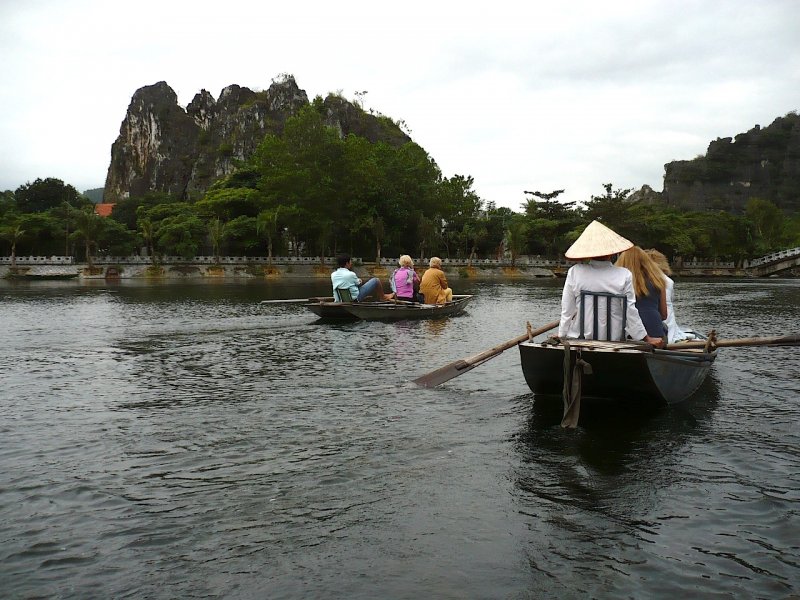 12.11.2013 Am besten lässt sich diese Landschaft bei einer Ruderbootfahrt ab Hoa Lu zu den Grotten von Tam Coc. genießen. Zu zweit besteigen die Teilnehmer unserer Gruppe je ein Ruderboot. Gerudert wird abwechselnd mit Armen und Füßen. Wir fahren aus dem Dorf Ninh Hải heraus, vorbei an steilen, zum Teil bizarren Felswänden und grünen Reisfeldern. Dann passieren wir die erste der 3 Grotten, deren längste mehr als 150 m lang ist. Die Grotten sind nur wenige Meter hoch, manchmal kann man die Decke mit der Hand berühren. Während der Regenzeit, wenn der Wasserstand um 1-2 m höher ist, sind diese Grotten nicht mehr passierbar. Es ist eine ruhige beschauliche Fahrt mit schönen Fotomotiven. Auf der Rückfahrt zur Anlegestelle geht unsere Beifahrerin dann zum geschäftlichen Teil über. Es werden alle Varianten Souvenirs ausgepackt und zum Kauf angeboten. Zum Glück sind wir schon früh gestartet, denn auf der Rückfahrt kommen uns unendlich viele mit Touristen beladene Boote entgegen und von der mystischen Stimmung ist nichts mehr zu spüren. Nach der Rückkunft dürfen wir erst einmal ausführlich bummeln gehen bevor es zum Mittagessen geht. Wir sind ganz glücklich endlich mal Zeit für unsere Einkäufe zu haben.