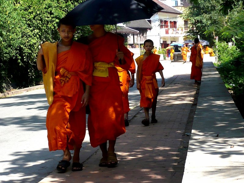 13.11.2013 Die morgendliche Aussicht aus meinem Fenster enttäuscht mich nicht. Noch leicht im Nebel liegend, umgeben von grünem Gebirge habe ich einen wunderschönen Blick auf die noch verschlafen wirkende Stadt. Luang Prabang war die Hauptstadt von Lane Xang, dem mächtigen Reich der 'ein Millionen Elefanten', und über Jahrhunderte Sitz der Könige von Laos. Bis heute ist Luang Prabang Zentrum des laotischen Buddhismus. Seit sich Laos öffnet und Luang Prabang zum Weltkulturerbe erklärt wurde, wird mit ausländischer Hilfe restauriert. Immer mehr Touristen besuchen die Stadt. Doch noch lebt Luang Prabang, wie es immer gelebt hat - im sanften Rhythmus der Religion, ruhig, fast gemächlich fließt die Zeit, in der alten Königsstadt am Mekong.