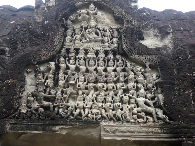 16.11.2014 Noch ein Tag im Zeichen der Tempel. Zunächst fahren wir nach Angkor Thom. Zur Blütezeit der einstigen Königsstadt im 12. Jahrhundert lebten hier auf etwa zehn Quadratkilometer rund eine Million Menschen - London hatte zur selben Zeit gerade einmal 50.000 Einwohner. Damit war Angkor Thom im Mittelalter die größte Stadt der Welt! Bevor man die Stadt durch eines der fünf Elefantentore betritt überquert man einen Wassergraben. Die Brücke wird rechts von einer Reihe Götter-Figuren und links von Dämonen geschmückt. Einige Touristen mieten sich einen Elefanten um über die Brücke weiter zu den Tempeln zu reiten. In der Mitte der Stadt Angkor Thom befindet sich der Tempel Bayon. Dieser dreigeschossige Bergtempel hat 54 Türme. Das Besondere an dieser Tempelanlage, sind die 216 Gesichter, die die Türme schmücken. Ein insgesamt 1,2 km langes Relief verziert die Wände. Dargestellt werden Szenen aus dem Leben im 12. Jahrhundert. Der Rundgang durch den Tempel ist schier überwältigend.